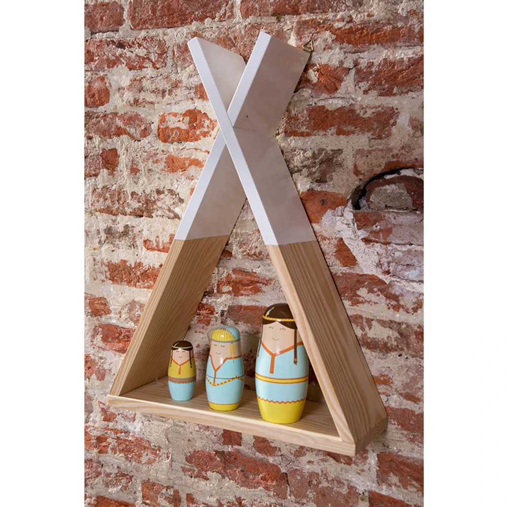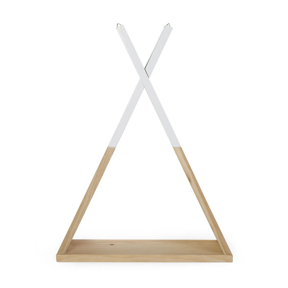 Petit étagère déco en forme de tipi. En bois, avec une partie peinte en blanc.