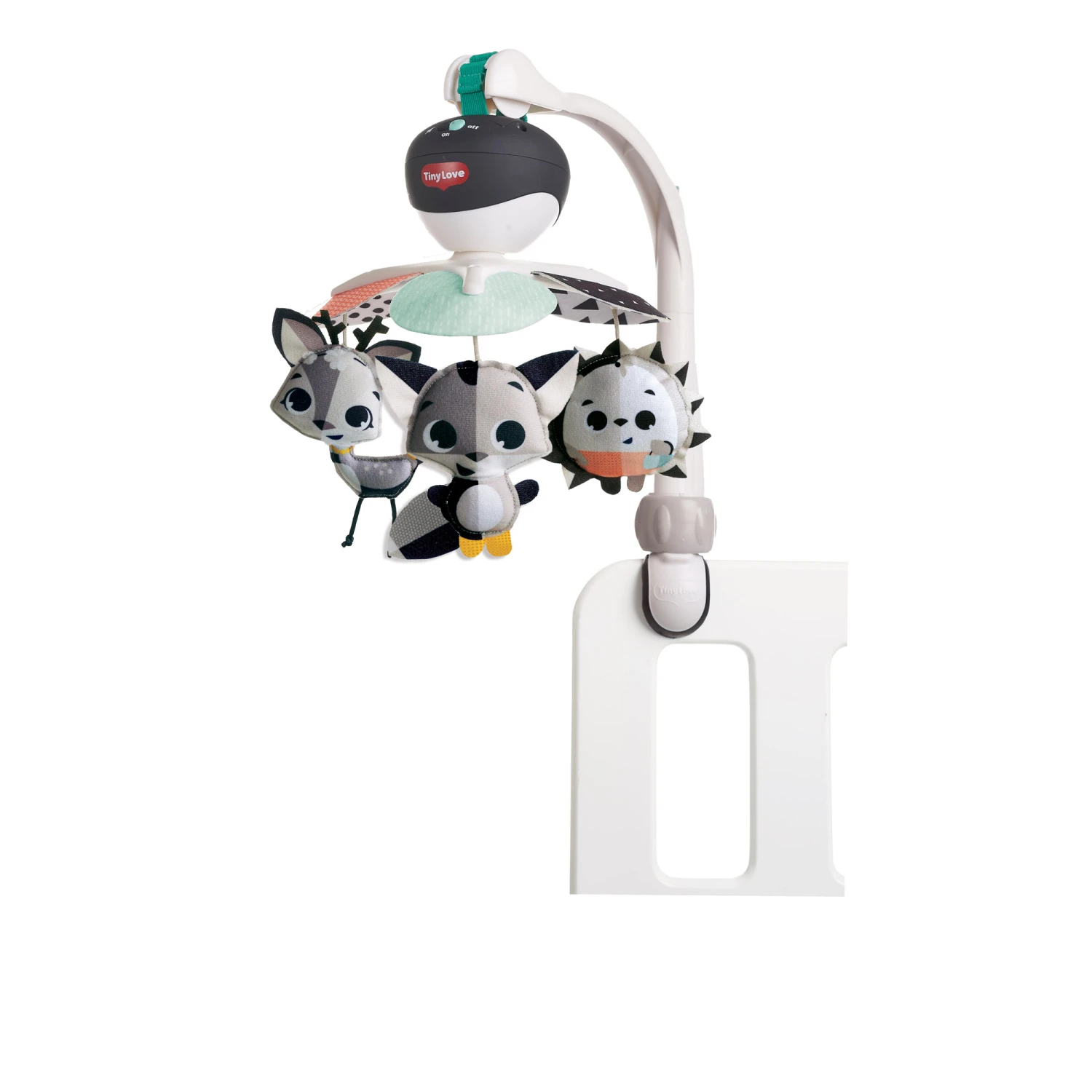 - Les grands yeux des personnages souriants et le léger mouvement du mobile, ainsi que la musique douce stimulent la vue et l’ouïe de Bébé.