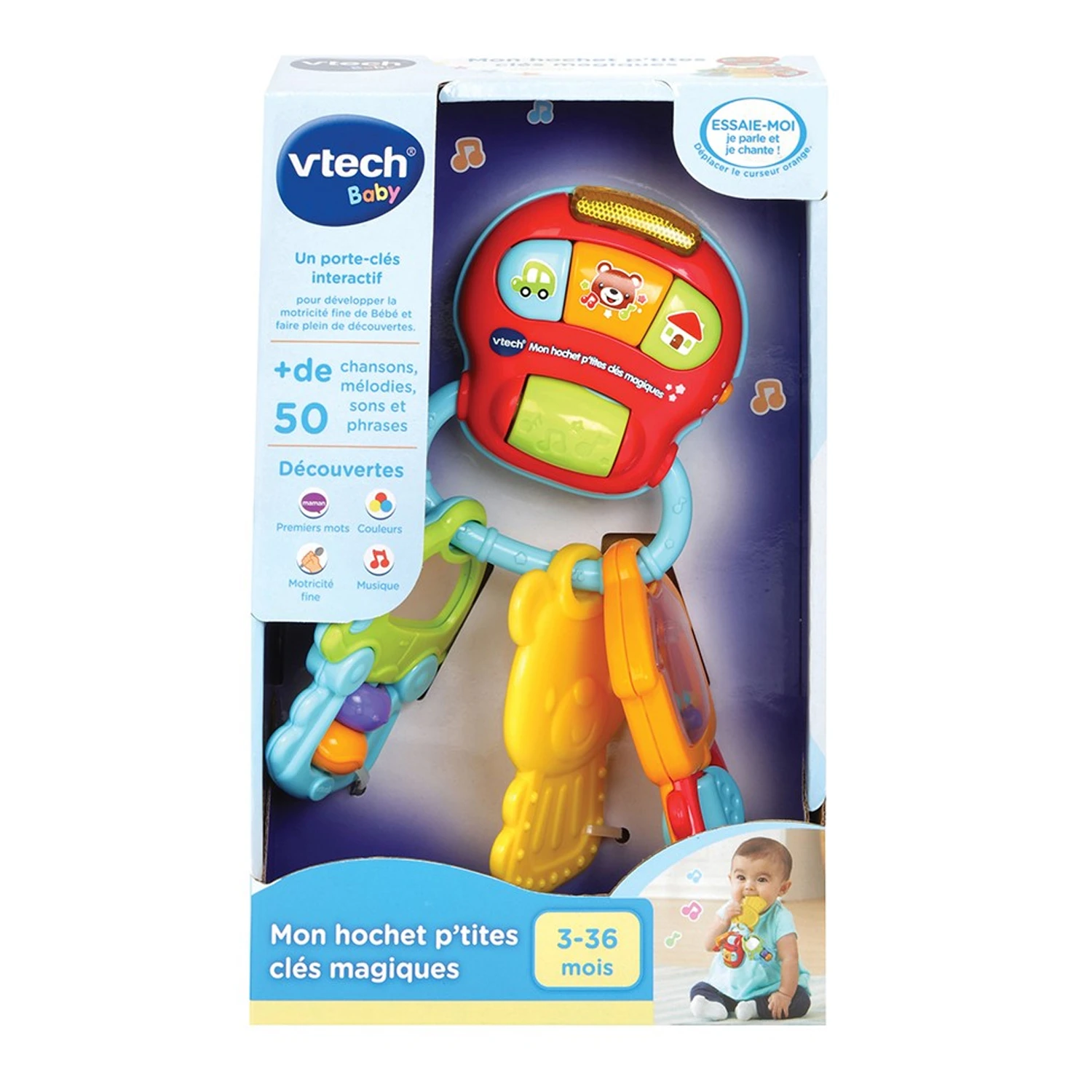 Grâce au détecteur de mouvement, Bébé déclenche des sons et des phrases amusantes lorsqu’il secoue son porte-clés. Les trois boutons Maison, Ourson et Voiture déclenchent des phrases, des chansons entrainantes et des effets lumineux. Il contient plusieurs éléments à manipuler pour développer la motricité fine de Bébé : un miroir, un rouleau, des petites billes, une clé de dentition…